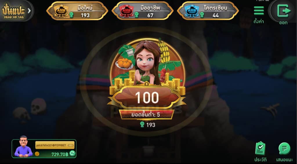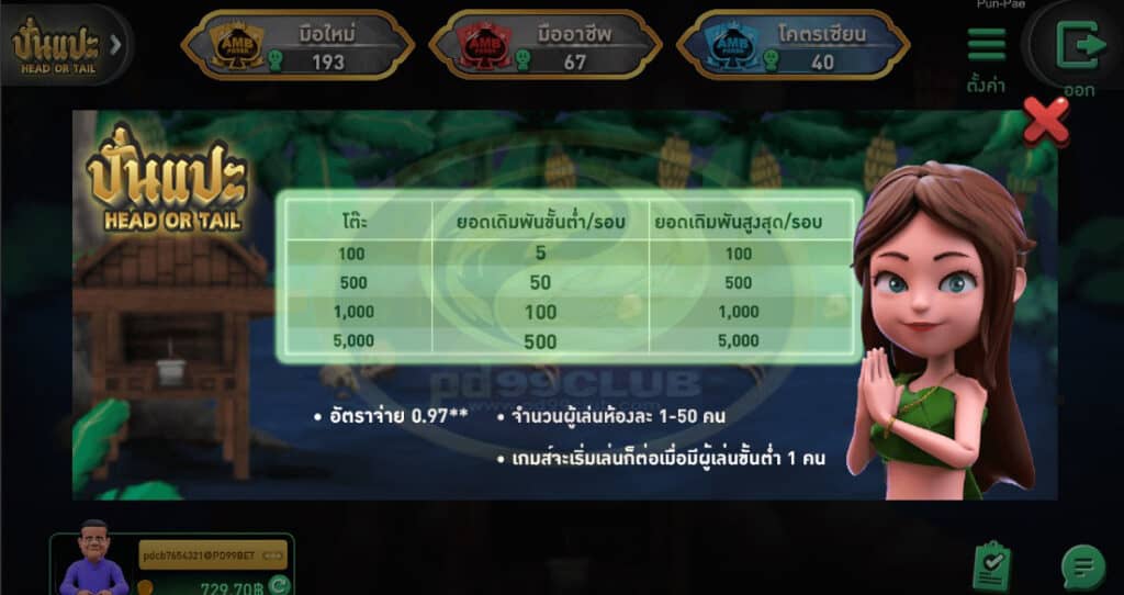 - วิธีเดิมพันมี 2 ประเภท คือ “หัว” และ “ก้อย” ผู้เล่นมีเวลา 15 วินาที ในการวางเดิมพัน