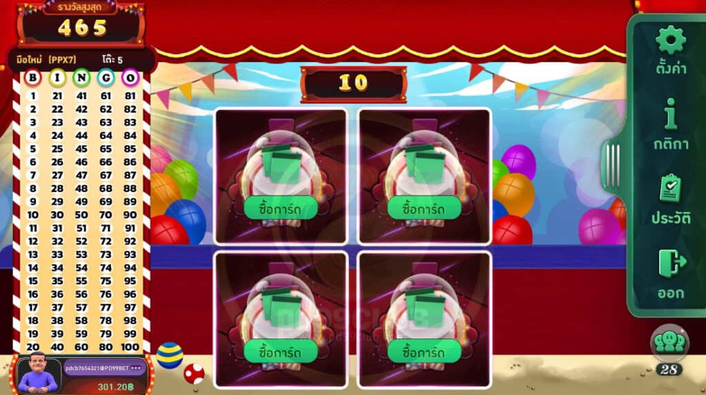 • เมื่อเข้าห้องมาเเล้วสามารถซื้อการ์ดบิงโกได้สูงสุด 4 ใบ หากไม่ถูกใจตัวเลขของการ์ดบิงโกที่ได้รับ สามารถกดสุ่มใบใหม่ได้ทันทีโดยไม่เสียค่าใช้จ่ายเพิ่ม