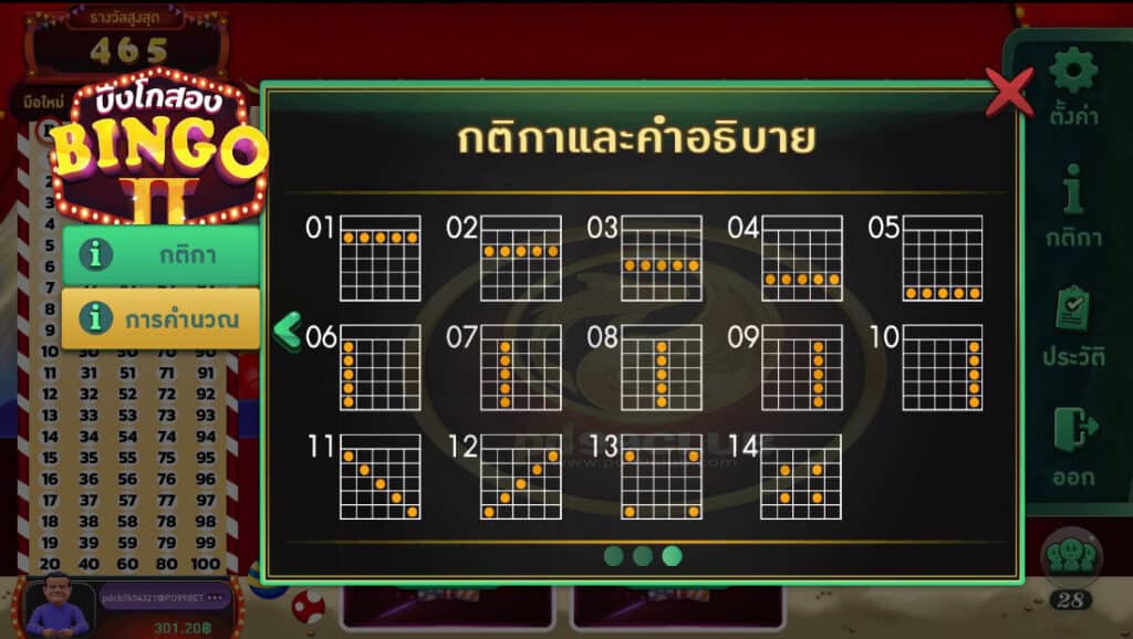 • ไลน์เดิมพันเกม บิงโก 2 มีทั้งหมด 14 ไลน์เดิมพัน