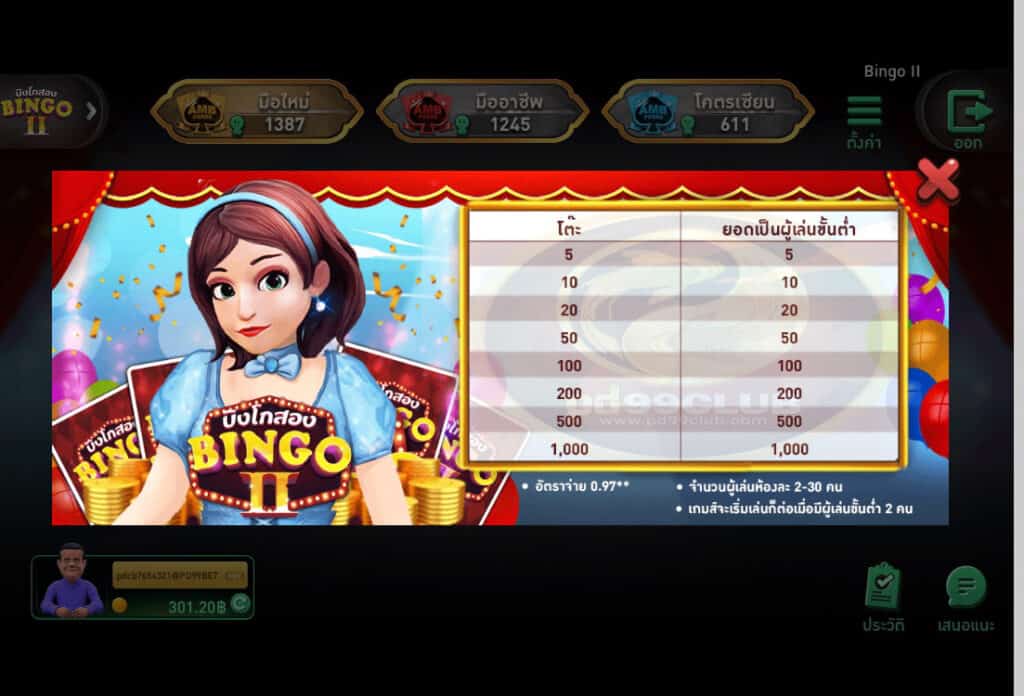 • ผู้เล่นได้บิงโกจะได้รับเงินเดิมพันของห้อง และได้รับ Luck Number ตามจำนวนที่ในการ์ดของผู้เล่นอาทิได้รับ 10,000 บาท หักค่าอัตราการจ่าย 1 : 0.97 = 9,700 บาท