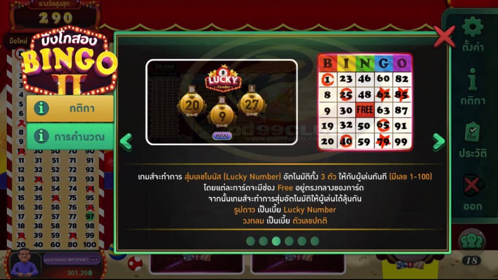 • เกมจะทำการสุ่มเลขโบนัส (Lucky Number) อัตโนมัติทั้ง 3 ตัว ให้กับผู้เล่นทันที (มีเลข 1 – 100) โดยเเต่ละการ์ดจะมีช่อง Frree อยู่ตรงกลางของการ์ดจากนั้นเกมจะทำการสุ่มอัตโนมัติให้ผู้เล่นได้ลุ้นกัน