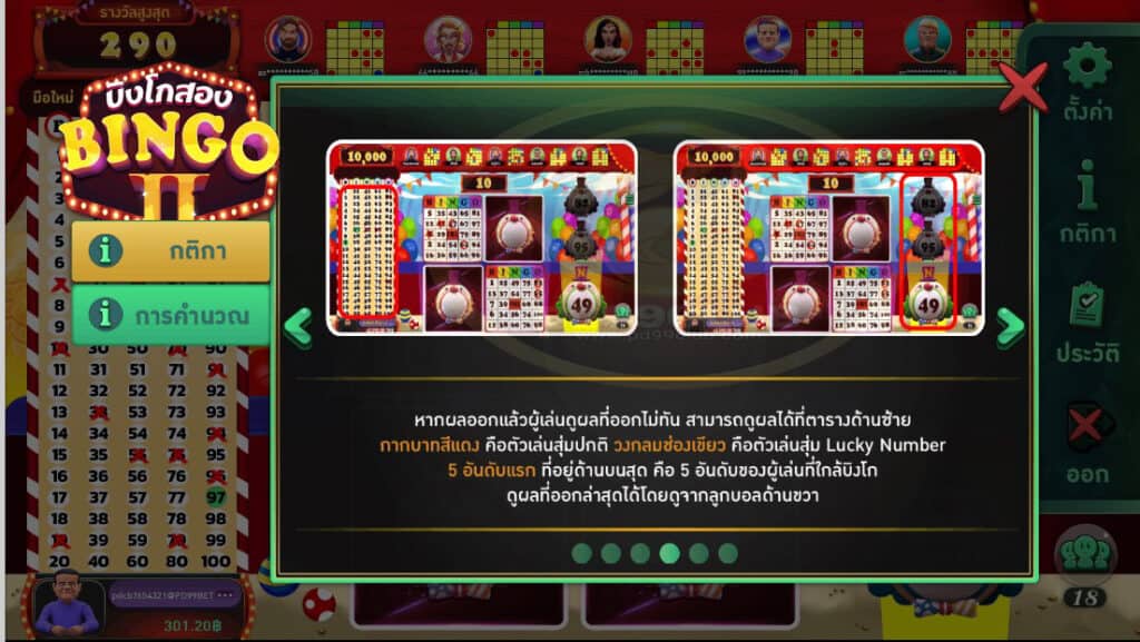 • หากผลออกแล้วผู้เล่นดูผลที่ออกไม่ทัน สามารถดูผลได้ที่ตารางด้านซ้าย กากบาทสีแดงคือตัวเล่นสุ่มปกติ วงกลมช่องเขียว คือตัวเล่นสุ่ม Lucky Number 5 อันดับเเรกที่อยู่ด้านบนสุดคือ 5 อันดับของผู้เล่นที่ใกล้บิงโก