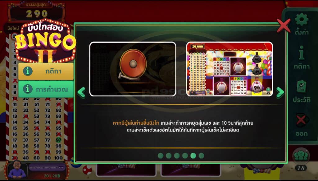 • หากมีผู้เล่นท่านอื่นบิงโก เกมจะทำการหยุดสุ่มเลขและ 10 วินาทีสุดท้ายเกมจะเช็คตัวเลขอัตโนมัติให้ทันทีหากผู้เล่นเช็คไม่สะดวก