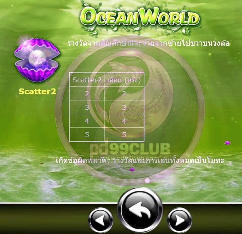- สัญลักษณ์ Scatter 1 2 (สแคทเทอร์) เป็นรูปหอยมุขประกาย เป็นสัญลักษณ์พิเศษที่จะพาเข้าสู้ฟีเจอร์ฟรีเกมส์ฟากได้สัญลักษณ์ 3 ตัวขึ้นไปสูงสุดจำนวน 25 เกมส์
