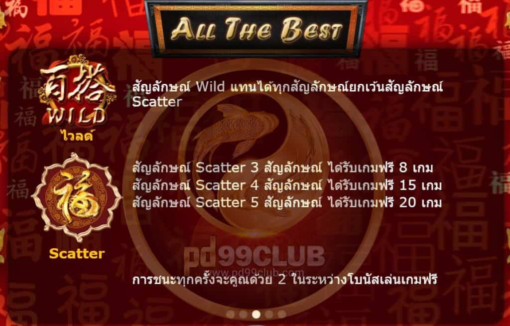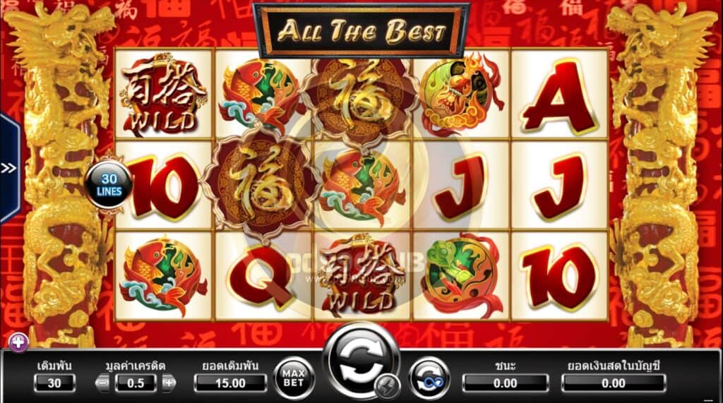 รีวิวเกมพร้อมกลเม็ดเคล็ดลับในการเล่นของเกม All the best ที่เปิดให้บริการการพนันออนไลน์ของค่าย amb988 ถือเป็นอีกตัวเลือกหนึ่งให้ลูกค้าสายนักปั่นสล็อตชอบในการเดิมพันเกมส์สล็อต ตัวเกมส์เข้าใจง่ายไม่ซับซ้อน เหมาะสำหรับทั้งมือใหม่และระดับเซียนโดยตัวเกมส์มาในรูปแบบตราประของจีนซึ่งมีสีสันออกไปในทางสีแดง และสีทอง คล้ายงานตรุษจีนเป็นเป็นพิธีการเฉลิมฉลองของชาวจีนสีสันฉูดฉาด ดูไปแล้วรื่นเริงครึกครื้นเกมส์สล็อตที่ดีที่สุด แตกบ่อย โดยเกมส์ๆนี้มีทั้งหมด 5 รีลและ 3 แถว มีเส้นไลน์ชนะมากถึง 30 ไลน์ ทุกแถวจจะจ่ายรางวัลตามเส้นจากซ้ายไปขวามือเท่านั้นคงที่ไม่มีการเปลี่ยนแปลง โดยเกมส์นี้สามารถลุ้นได้ทั้งโบนัสฟรีและแจ็คพ็อตใหญ่ สัญลักษณืพิเศษมีทั้งหมด 10 ตัว แต่ละตัวมีค่ารางวัลที่สูงและไม่เท่ากันในการกดสปินไปเรื่อยๆ สามารถลุ้นรับแจ็คพ็อตก้อนโตได้ทุกท่านและมีรางวัลแจ็คพ็อตทั้งหมดแบ่งเป็นสองระดับคือ Gold และระดับ Silver ซึ่งโอกาสชนะมีสูงขึ้นเนื่องจากมีระดับให้เลือกขึ้นอยู่กับเพียงยอดเดิมพันเท่านั้นเอง ยิงวางเดิมพันสูงย่อมมีโอกาศคว้ารางวัลใหญ่กลับบ้านเพิ่มมากยิ่งขึ้น มีการสุ่มฟีเจอร์ฟรีสปินและแจกฟรีสปินตลอดทั้งเกมส์เหมาะสำหรับงบน้อยก็เล่นได้ เราจะมาดูทั้งอัตราการจ่ายรางวัลและสัญลักษณ์พิเศษต่างๆ และวิดีโอแนะนำเกมส์กันเลยค่ะ