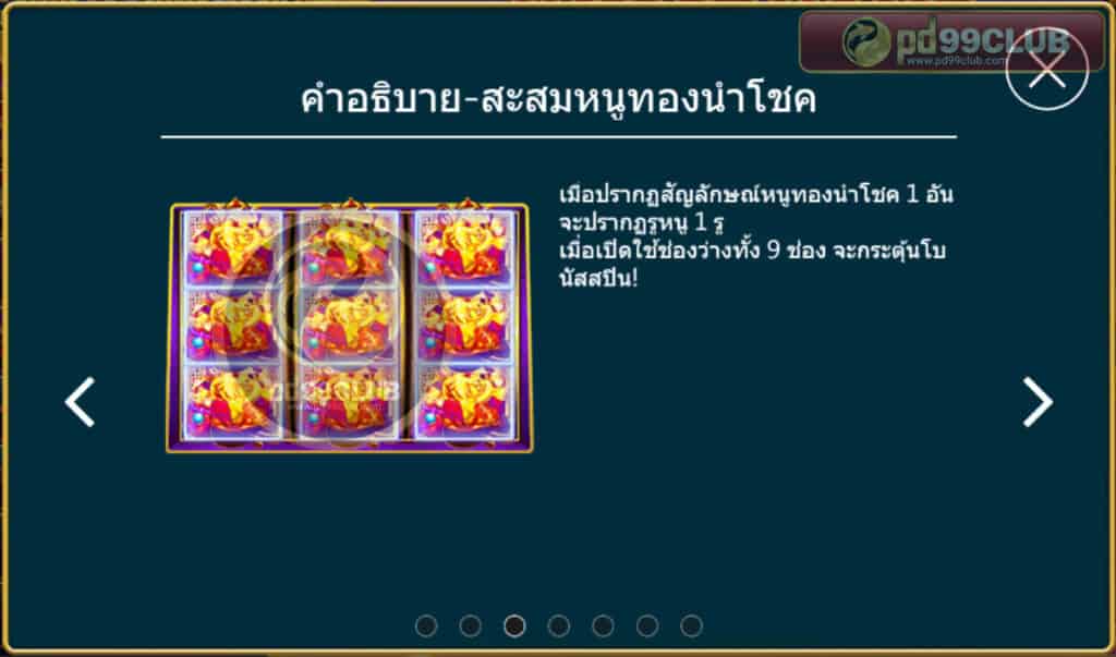 เมื่อปรากฏสักษณ์หนูทองนำโชค 1 อันจะปรากฏรูหนู 1 รู เมื่อเปิดใช้ช่องว่างทั้ง 9 ช่อง จะกระตุ้นโบนัสสปินฟรีทันที!