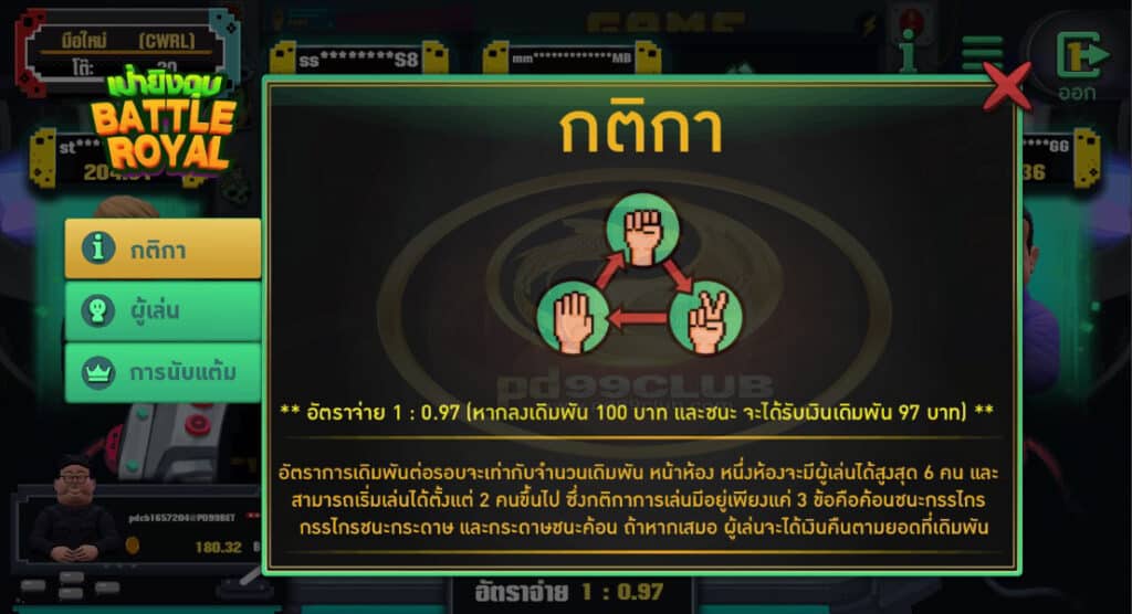 - อัตราเดิมพันต่อรอบจะเท่ากับจำนวนเดิมพันหน้าห้อง หนึ่งห้องจะมีผู้เล่นได้สูงสุด 6 คน เเละสามารถเริ่มเล่นได้ตั้งเเต่ 2 คนขึ้นไป ซึ่งกติกาการเล่นมีอยู่เพียงเเค่ 3 ข้อคือ ค้อนชนะกรรไกร กรรไกรชนะกระดาษ เเละกระดาษชนะค้อน ถ้าหากเสมอผู้เล่นจะได้เงินตืนตามยอดที่วางเดิมพัน