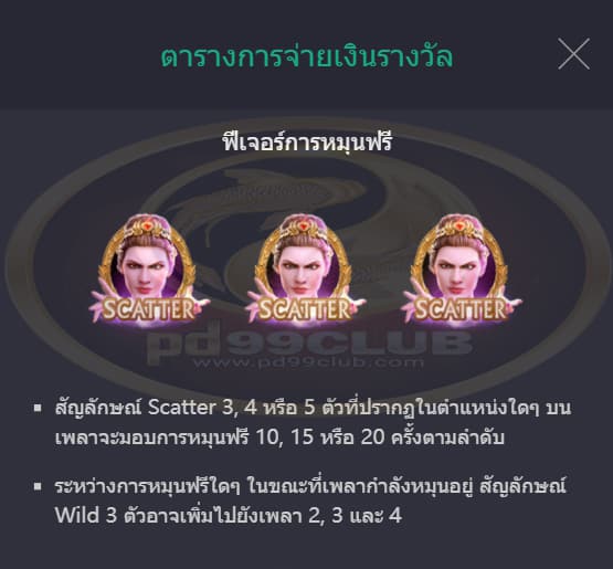 • จะเล่นฟีเจอร์การหมุนฟรีด้วยขนาดและระดับเดิมพันเดียวกันกับการหมุนที่เริ่มฟีเจอร์การหมุนฟรีนั้น