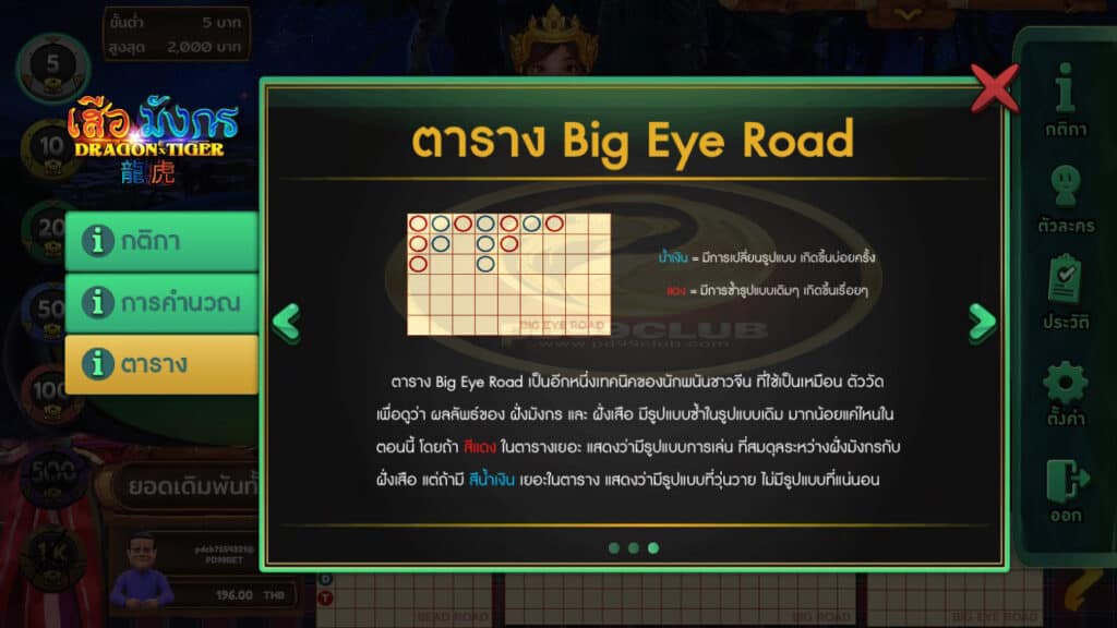 - ตาราง Big Eye Road เป็นอีกหนึ่งเทคนิคของนักพนันชาวจีนที่ใช้เป็นเหมือนตัววัดเพื่อดูว่าผลลัพธ์ของฝั่งมังกรและฝั่งเสือมีรูปแบบซ้ำในรูปแบบเดิมมากน้อยแค่ไหนในตอนนี้โดยถ้าสีแดงในตารางเยอะแสดงว่ามีรูปแบบการเล่นที่สมดุลระหว่างฝั่งมังกรกับฝั่งเสือ แต่ถ้ามีสีน้ำเงินเยอะในตารางแสดงว่ามีรูปแบบที่วุ่นวายไม่มีรูปแบบที่แน่นอน