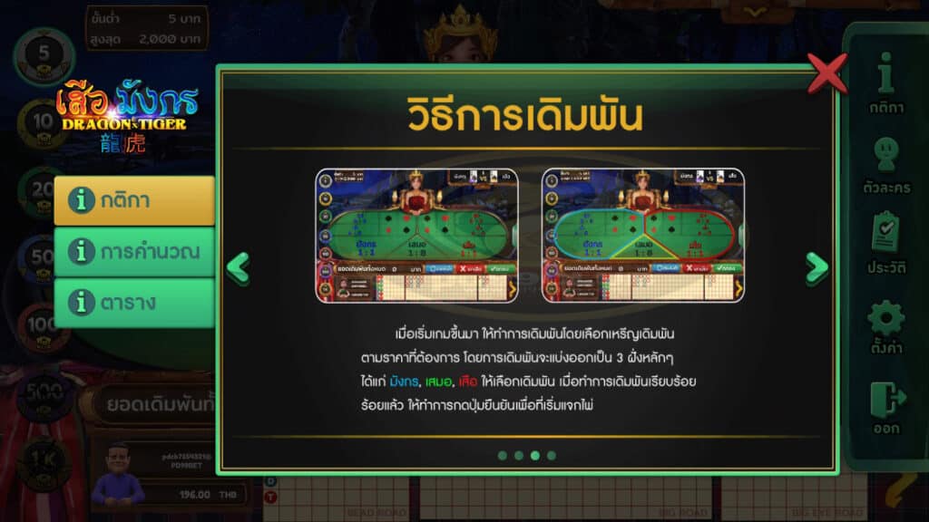 - เมื่อเริ่มเกมขึ้นมาให้ทำการเดิมพันโดยเลือกเหรีญเดิมพันตามราคาที่ต้องการโดยการเดิมพันจะแบ่งออกเป็น 3 ฝั่งหลักๆ ได้แก่ มังกร, เสมอ, เสือให้เลือกเดิมพันเมื่อทำการเดิมพันเรียบร้อยร้อยแล้วให้ทำการกดปุ่มยืนยันเพื่อที่เริ่มแจกไพ่