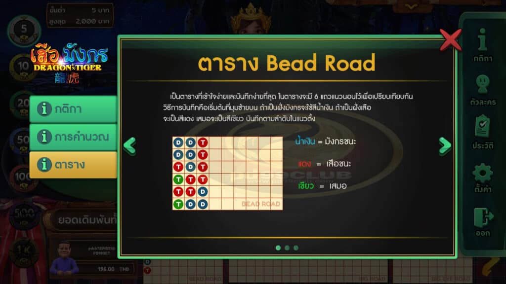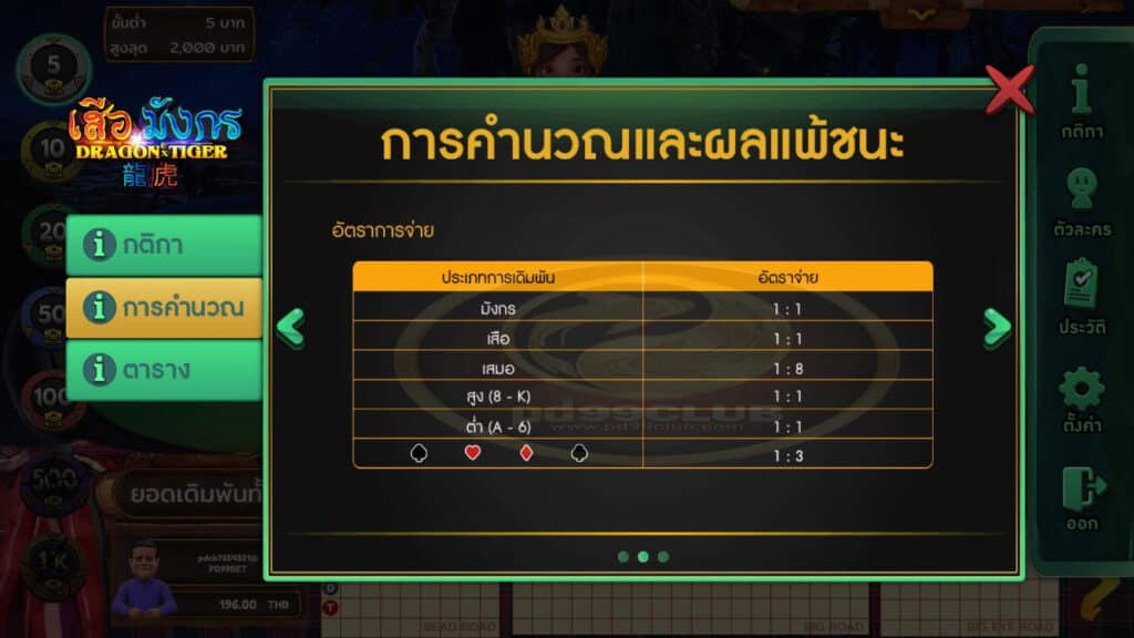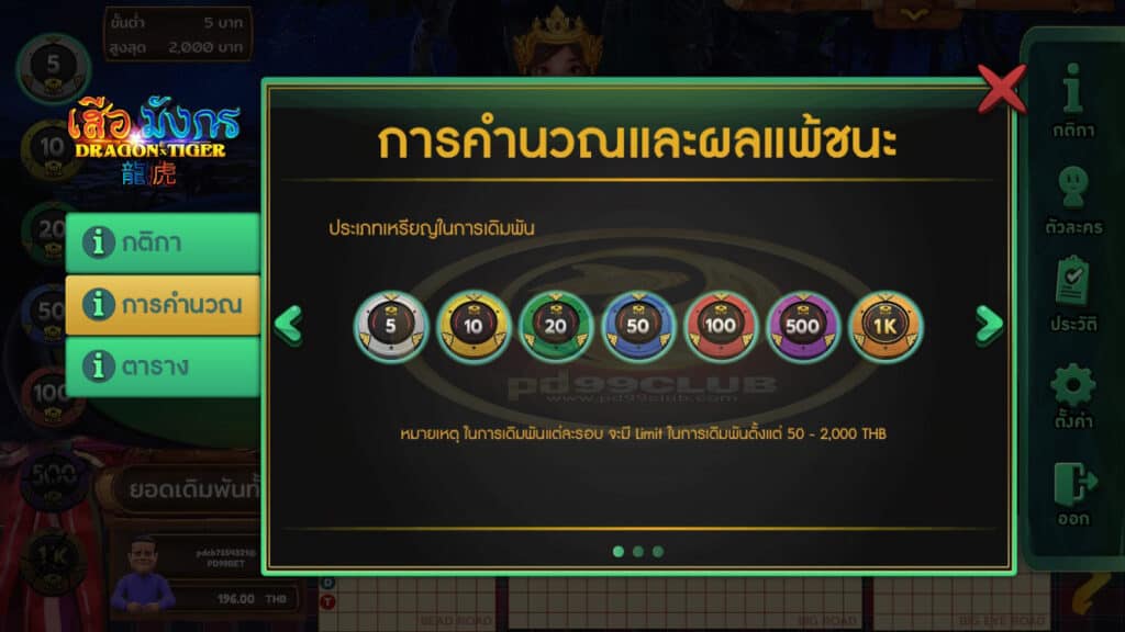 - หมายเหตุ: ในการเดิมพันแต่ละรอบจะมี Limit ในการเดิมพันตั้งแต่ 50-2,000 THB