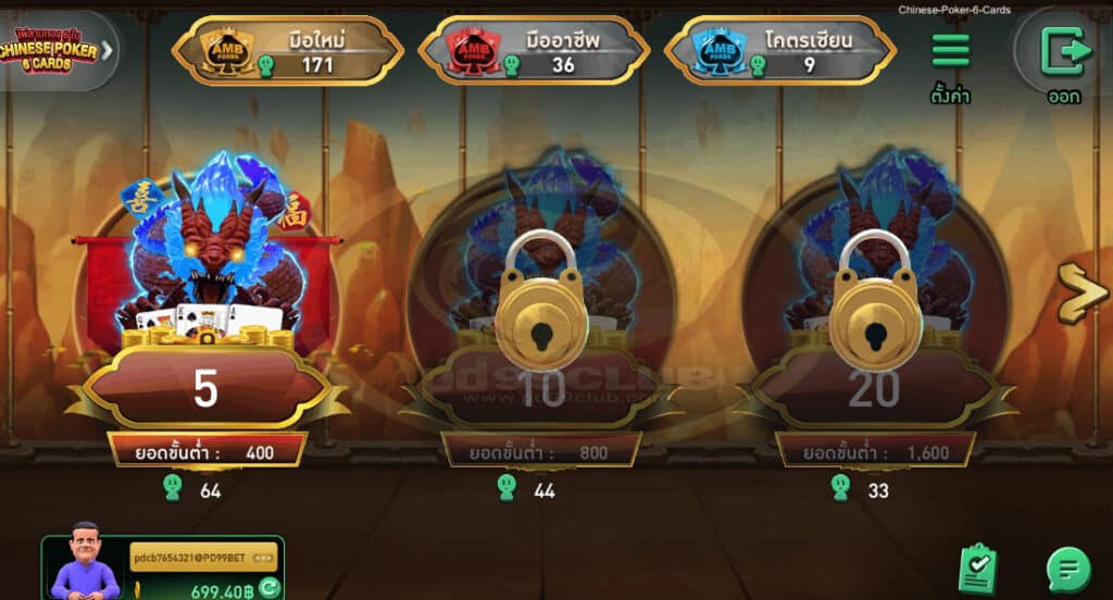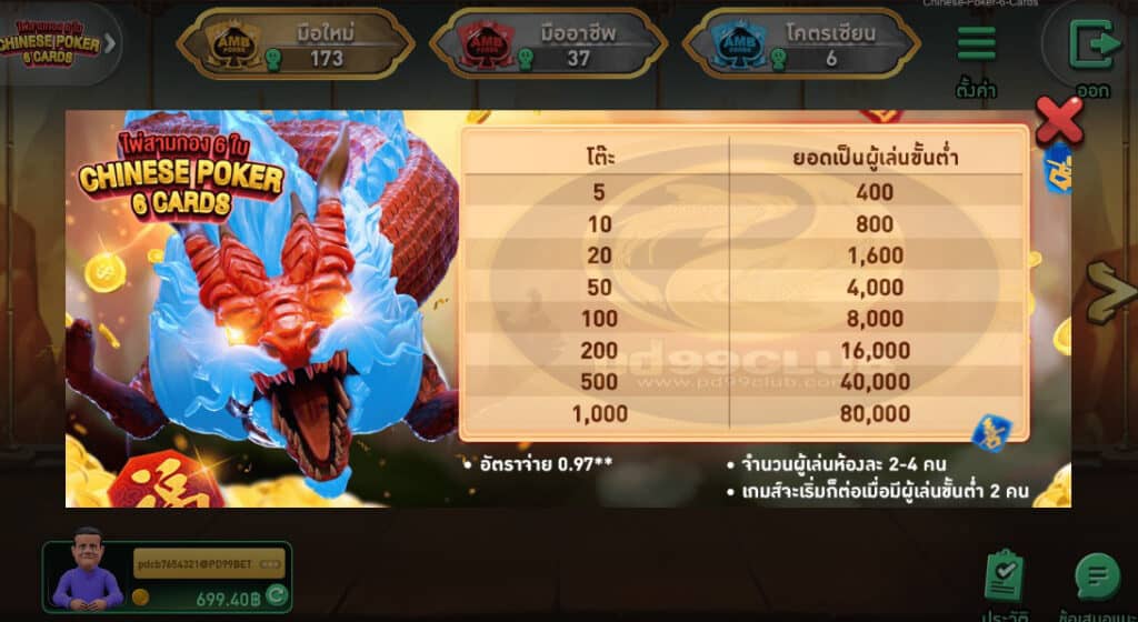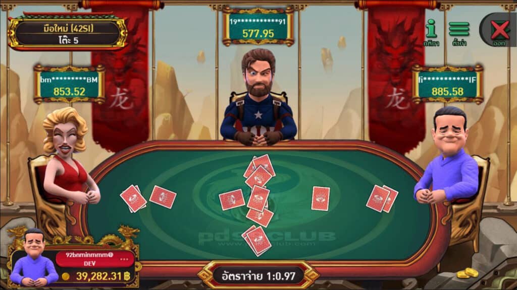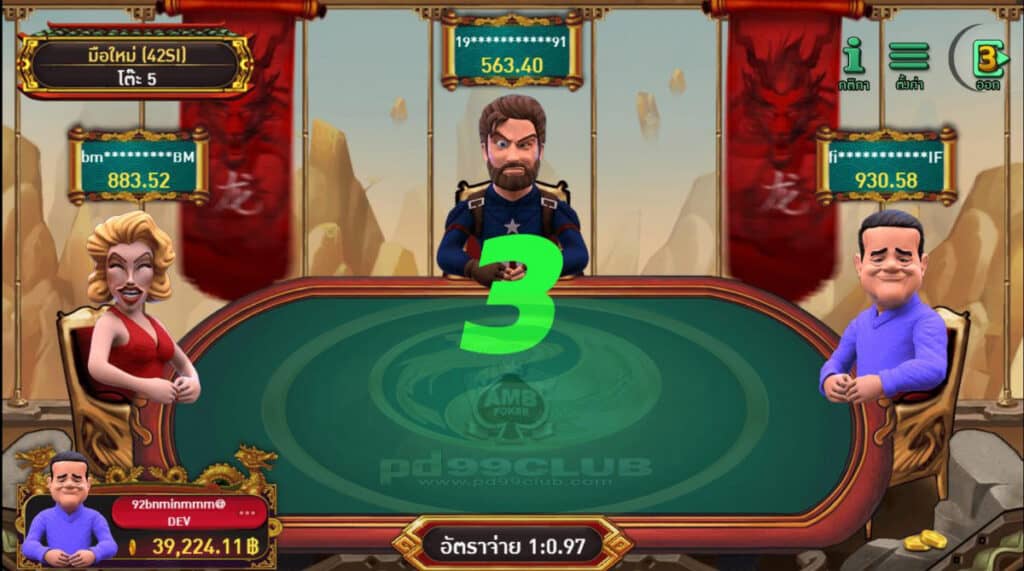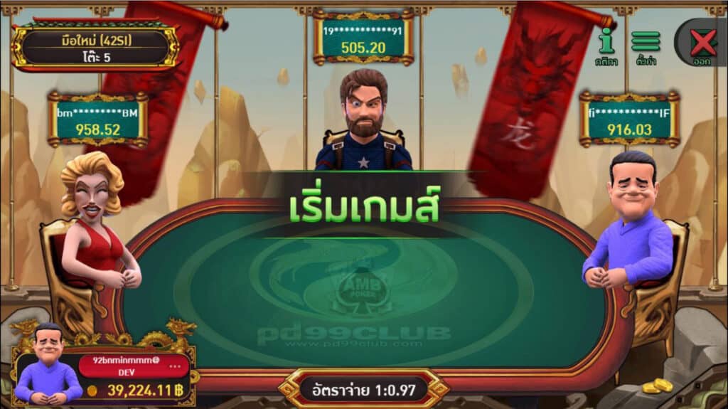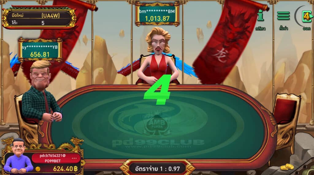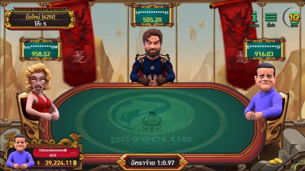 - เข้าสู่โต๊ะจะพบผู้เล่นในห้อง โดย 1 ห้องระบบเกมจะเริ่มเกม 3 คนขึ้นไปเเละเเต่ละห้องจะเต็ม 4 คน