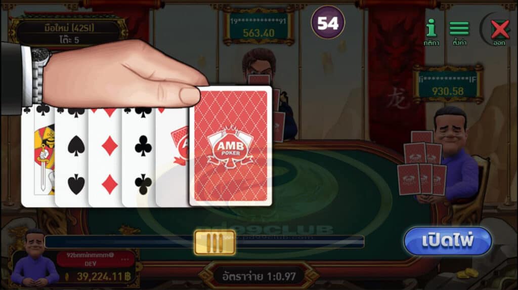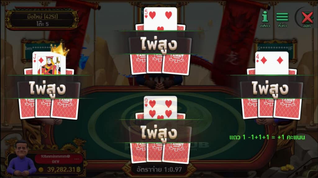 - เมื่อระบบจับไพ่เเถวที่ 1 ระบบเกมจะเริ่มหงายไพ่แถวที่ 2 เพื่อวัดไพ่บนมือผู้เล่นทุกคนใครมีไพ่สูงที่สุด