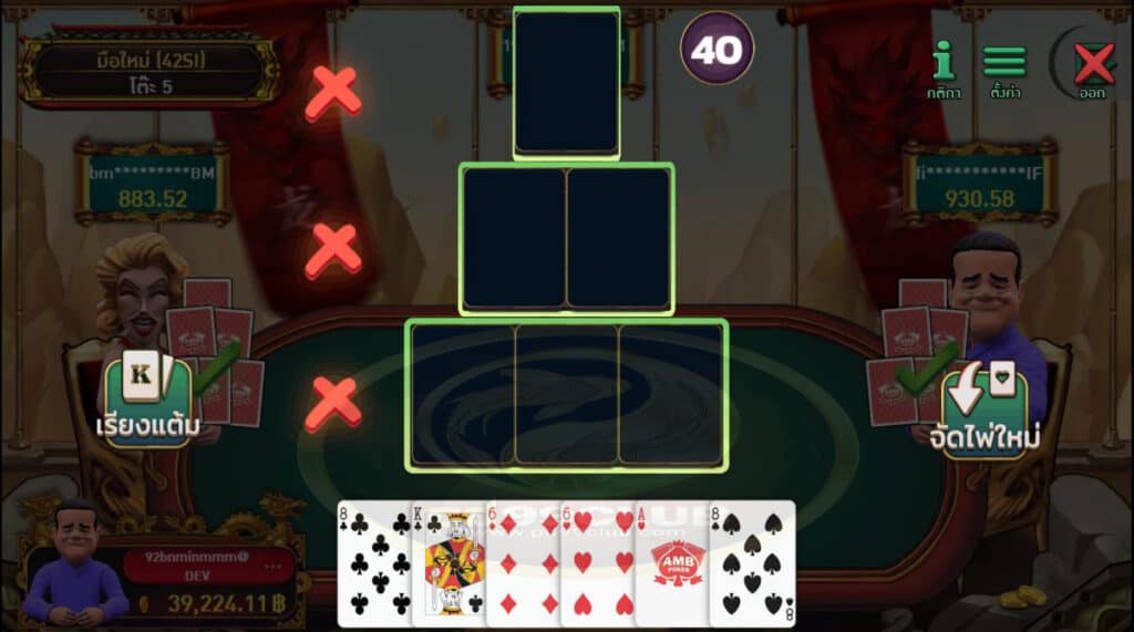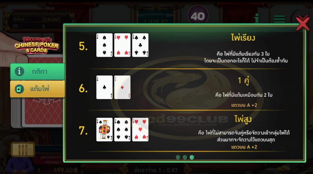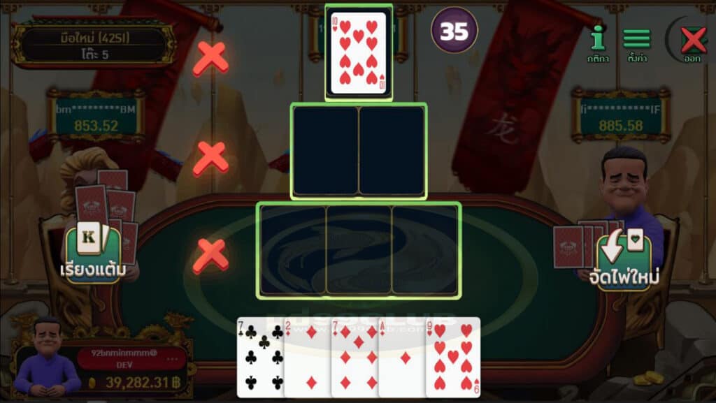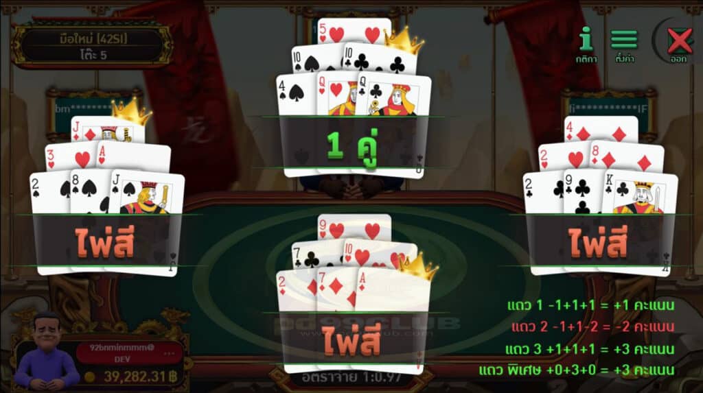 - แถวล่างวางไพ่ได้ 3 ใบ ต้องมีเเต้มมากกว่าเเถวบนเเละเเถวกลาง