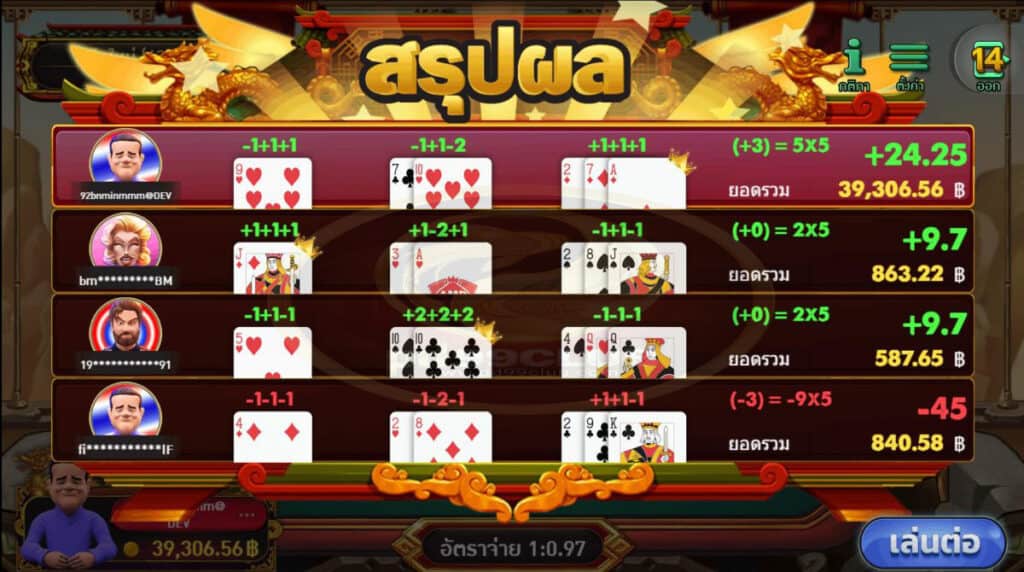 - เมื่อระบบเกมได้ผู้เล่นชนะเเละผู้เล่นแพ้ระบบจะทำการคำนวณ เงินรางวัล ให้ผู้เล่นทุกคนบนโต๊ะในฉบับตาราง และบันทึกประวัติการเล่นของผู้เล่น