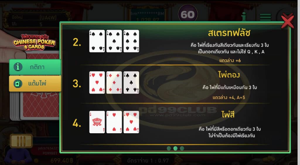 - ไพ่สเตรทฟรัช (แถว 3) อัตราการจ่าย 6 เท่า