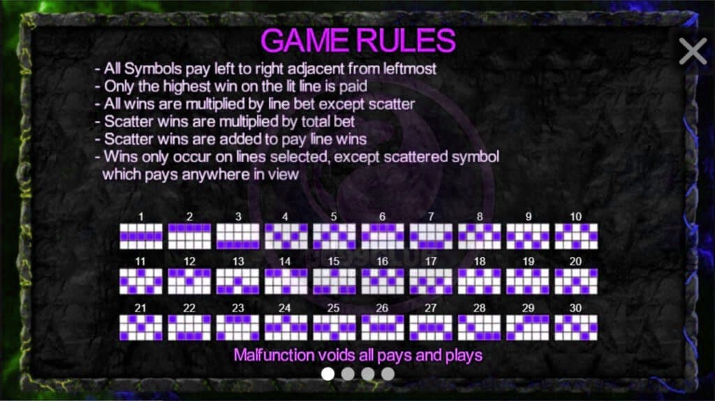 - รางวัลจะได้รับเฉพาะจากแถวที่เลือกไว้ ยกเว้นสัญลักษณ์กระจายจะจ่ายรางวัลไม่ว่าจะอยู่ที่ใดบนหน้าจอ