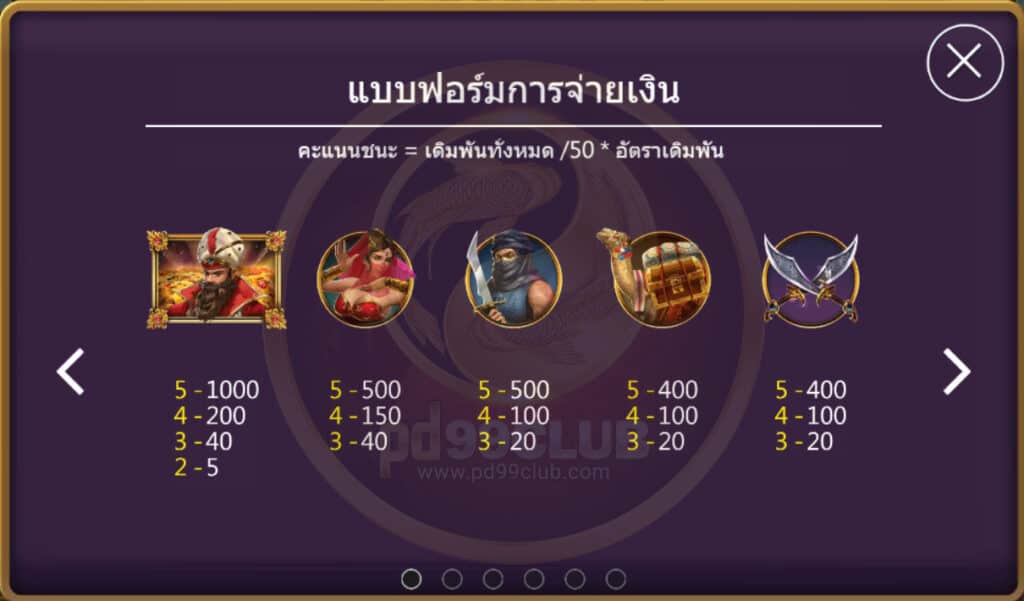 จะมีด้วยกันทั้งหมด 11 สัญลักษณ์ คะแนนชนะ=เดิมพันทั้งหมด/50*อัตราเดิมพัน