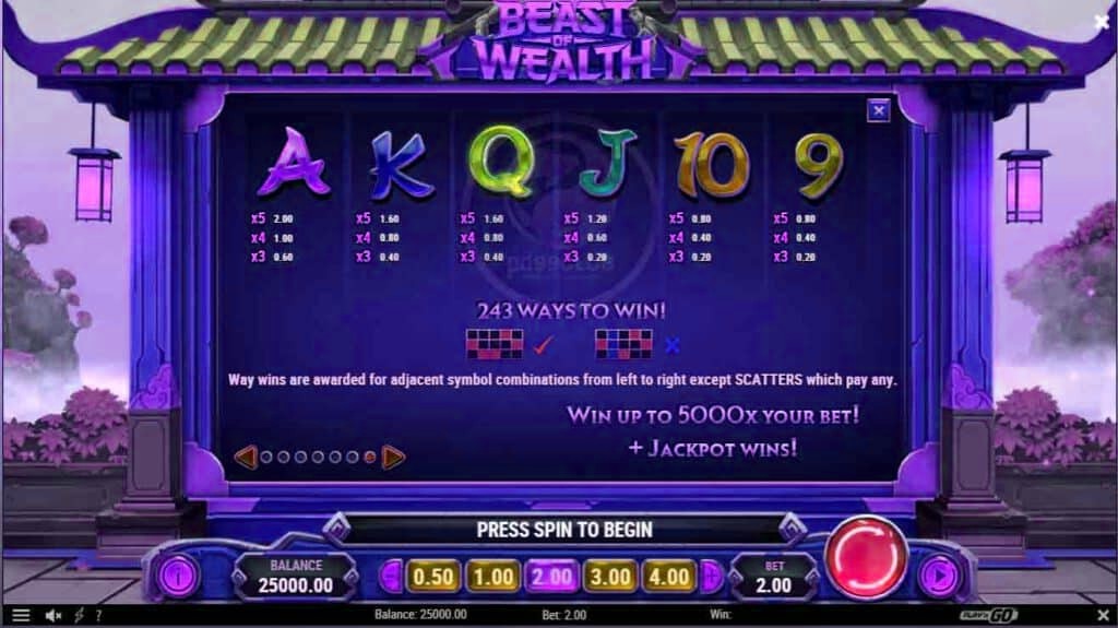 เกมสล็อต Beast of Wealth เป็นเกมสล็อตออนไลน์ 5×3 ถูกพัฒนาโดย mgm99win มีรูปแบบทีมเป็นบ้านทรงจีนได้รับการรับแรงบันดาลใจมาจากตำนวนสัตว์ศักดิ์สิทธิ์ผู้พิทักษ์ทั้ง 4 ทิศ ซึ่งสัญลักษณ์หลักภายในเกมคือ มังกร เสือ เต่า นกฟีนิกซ์ และสัญลักษณ์ที่เหลือก็จะเหมือนกับเกมสล็อตทั่วไป คือ 9, 10, J, Q, K และ A บอกได้เลยว่าเป็นอีกหนึ่งเกมสล็อตที่น่าเล่นและได้รับความนิยมอย่างมากในปัจจุบัน เป็นเกมสล็อตรูปแบบ 5 รีล 3 แถว อัตราการจ่ายเงินภายในเกม สัญลักษณ์ที่มีแต้มมากที่สุดคือ มังกร ซึ่งให้แต้มสูงถึง 10.00 รองลงให้เป็น 5.00 ,3.00 ,2.00 และน้อยที่สุดคือ 0.30 อัตราการจ่ายเงินภายในเกมจะแตกต่างกันขึ้นอยู่กับสัญลักษณ์และผลคูณนั้นๆ