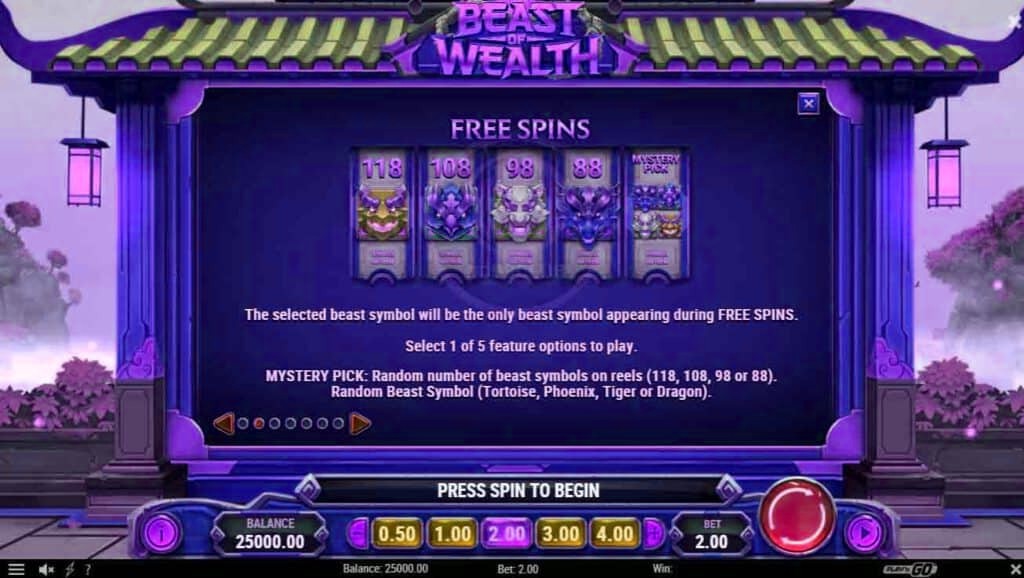 - Mystery Pick : จำนวนสัญลักษณ์แบบสุ่มบนวงล้อ (118 , 108 , 98 หรือ 88)