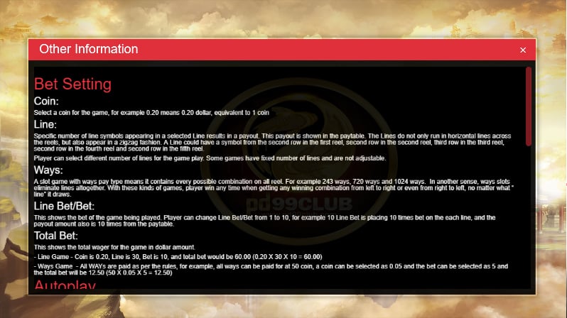 - ทุกรูปแบบจะได้รับเงินตามกฎตัวอย่างเช่นทุกรูปแบบสามารถจ่ายได้ 50 เหรียญสามารถเลือกเหรียญเป็น 0.05 และสามารถเลือกเดิมพันเป็น 5 แล้วเดิมพันทั้งหมดจะเท่ากับ 12.50 (50 X 0.05 X 5 = 12.50)