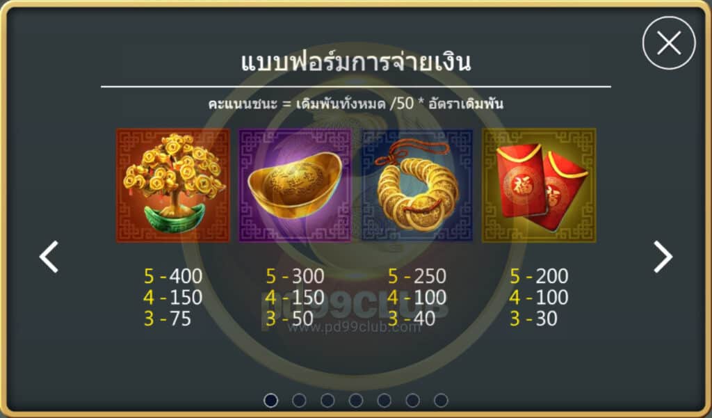 คะแนนชนะ=เดิมพันทั้งหมด/50*อัตราเดิมพัน จ่ายเริ่มต้น 10 บาท สูงสุด 400 ต่อสัญลักษณ์