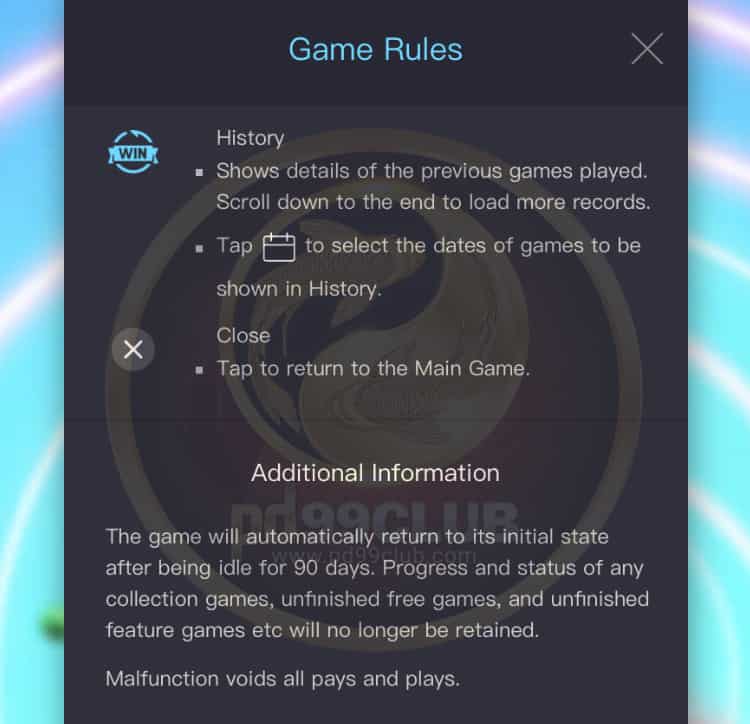 - เกมจะกลับสู่สถานะเริ่มต้นโดยอัตโนมัติหลังจากที่ไม่มีการใช้งานเป็นเวลา 90 วัน ความคืบหน้าและสถานะของเกมคอลเลกชันเกมฟรีที่ยังไม่เสร็จและเกมฟีเจอร์ที่ยังไม่เสร็จ ฯลฯ จะไม่ถูกเก็บไว้อีกต่อไป การทำงานผิดพลาดจะทำให้การจ่ายเงินและการเล่นทั้งหมดเป็นโมฆะ