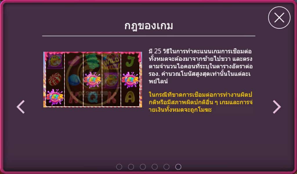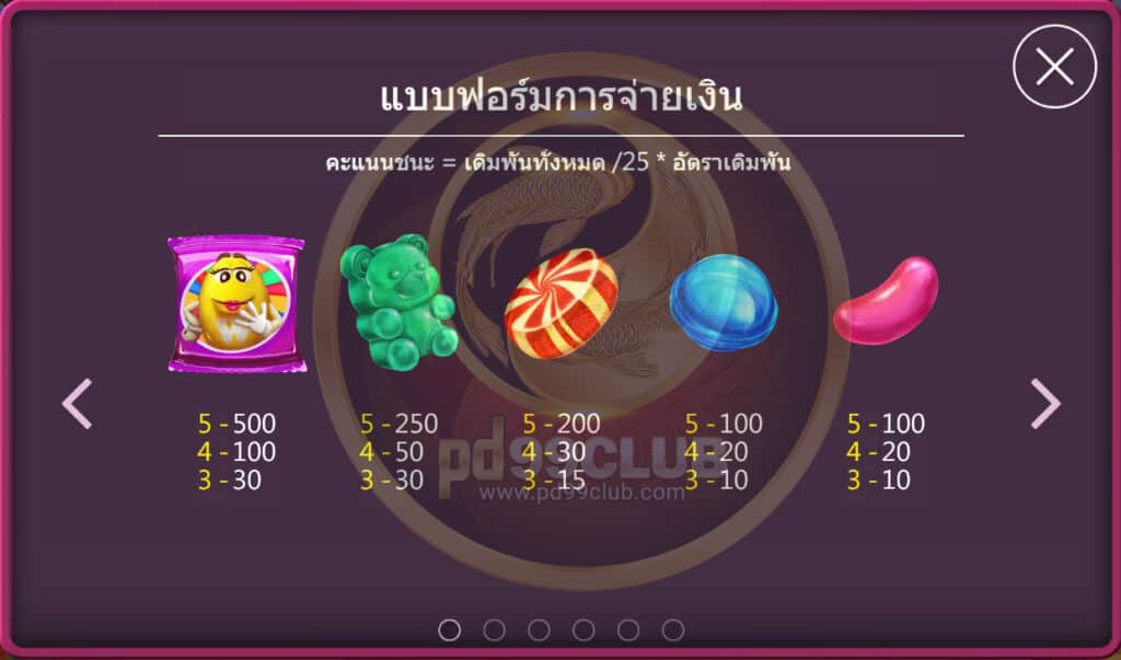 มีทั้งหมด 9 สัญลักษณ์ คะแนนชนะ=เดิมพันทั้งหมด/25*อัตราเดิมพัน อัตราการจ่ายของเกมเริ่มที่ 2 บาท จ่ายสูงสุด 500 บาท