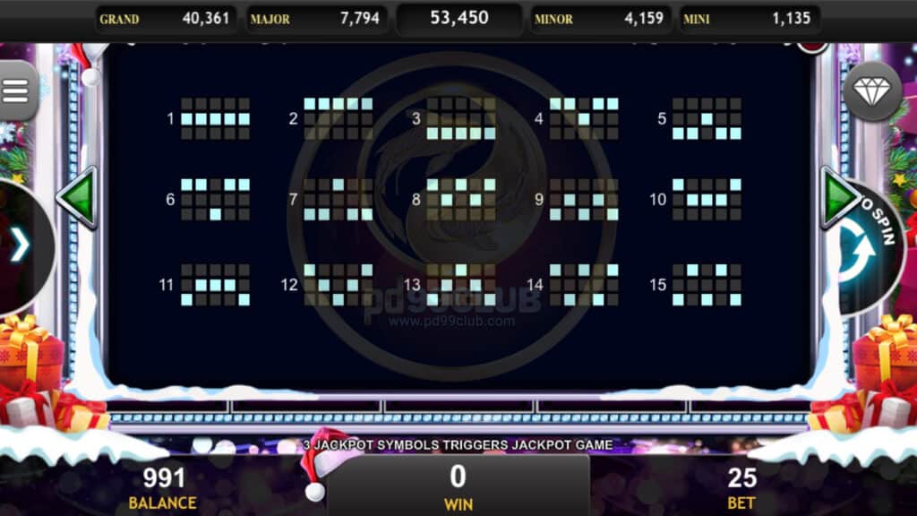 สัยลักษณ์ XMAS WILD,Free Spin,Jackpot และ สัญลักษณ์การจ่าย