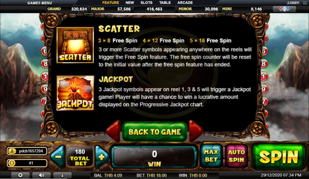 สัญลักษณ์ Scatter 3 x 8 Free Spin 4 x 12 Free Spin 5 x 16 Free Spin 3 หรือมากกว่าสัญลักษณ์ Scatter ที่ปรากฏที่ใดก็ได้บนวงล้อจะเรียกใช้คุณสมบัติ Free Spin ตัวนับการหมุนฟรีจะถูกรีเซ็ตเป็นค่าเริ่มต้นหลังจากสิ้นสุดคุณสมบัติการหมุนฟรี