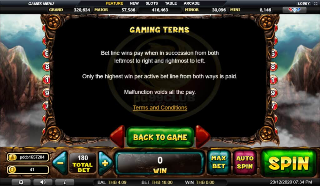 กฏกติกา เงื่อนไขการเล่นเกมสายการเดิมพันชนะการจ่ายเงินเมื่อต่อเนื่องกันจากซ้ายสุดไปขวาและขวาสุดไปซ้าย เฉพาะผู้ชนะสูงสุดต่อไลน์เดิมพันที่ใช้งานจากทั้งสองทางเท่านั้นที่จะได้รับเงิน ความผิดปกติทำให้การจ่ายเงินทั้งหมดเป็นโมฆะ