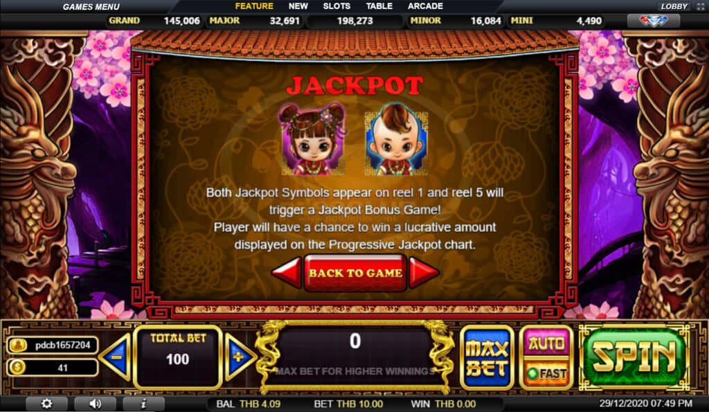 สัญลักษณ์ Jackpot ทั้งสองปรากฏบนรีล 1 และรีล 5 จะทำให้เกมแจ็คพอตโบนัส! ผู้เล่นจะมีโอกาสชนะรางวัลเป็นจำนวนเงินที่แสดงในแผนภูมิโปรเกรสซีฟแจ็คพอต