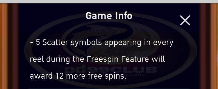 - สัญลักษณ์ Scatter 5 ตัวที่อยู่ในทุกแถว ระหว่างฟีเจอร์การหมุนฟรีจะมอบรางวัลการหมุนฟรีเพิ่มอีก 12 รอบ