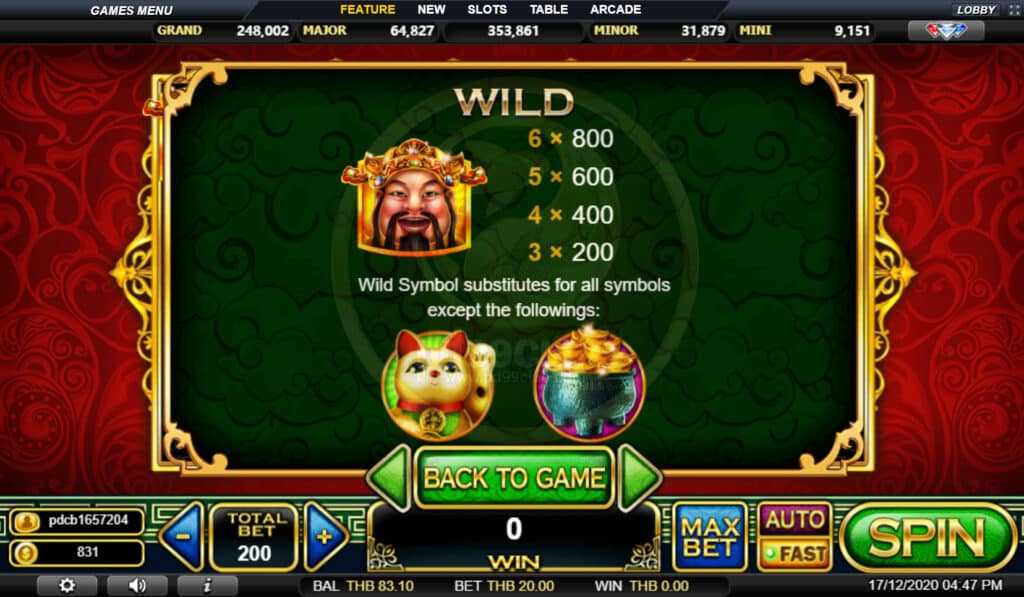 สัญลักษณ์ Wild สามารถใช้ทดแทนทุกสัญลักษณ์ยกเว้นสัญลักษณ์ Scatter และ Jackpot