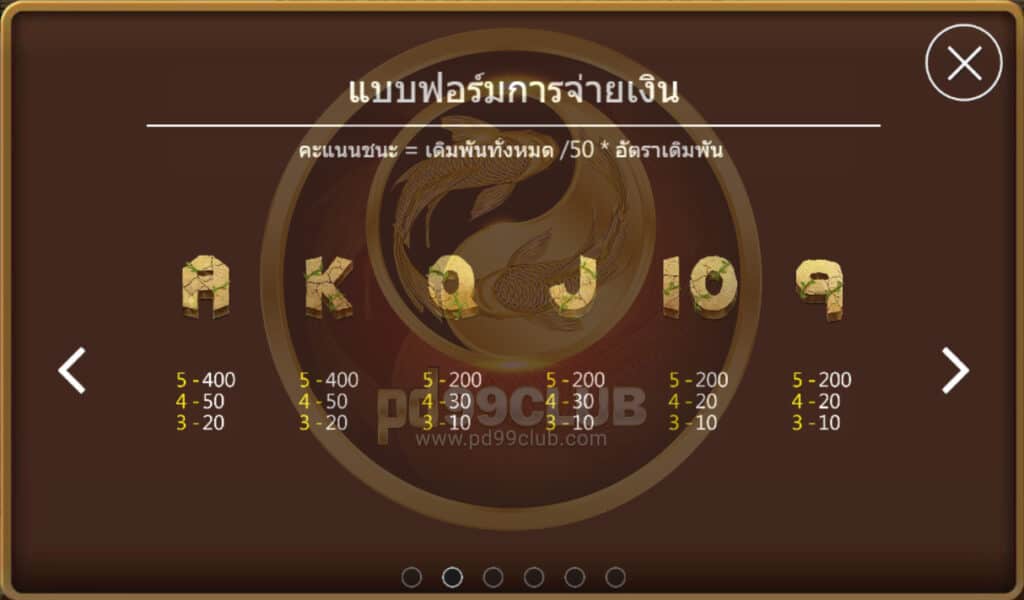 มีทั้งหมด 11 สัญลักษณ์ คะเเนนชนะ=เดิมพันทั้งหมด/50*อัตราเดิมพัน