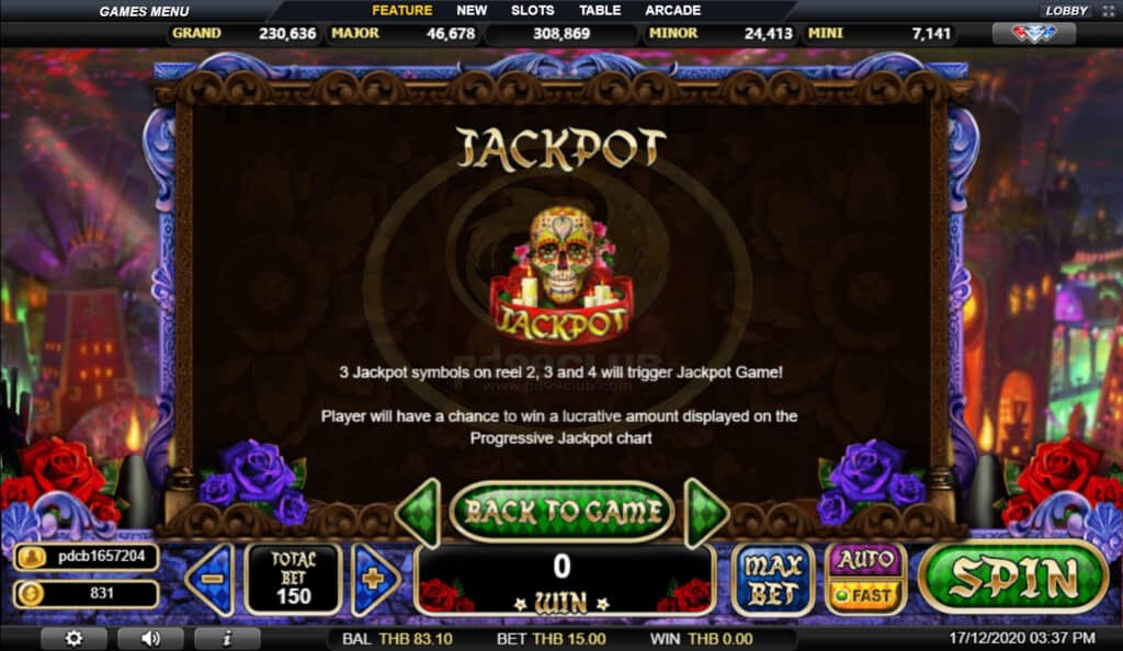 สัญลักษณ์ Jackpot 3 สัญลักษณ์จะปรากฏบนรีล 2, 3 และ 4 จะทำให้เกมแจ็คพอตขึ้น ผู้เล่นจะมีโอกาสชนะรางวัลเป็นจำนวนเงินที่แสดงในแผนภูมิโปรเกรสซีฟแจ็คพอต
