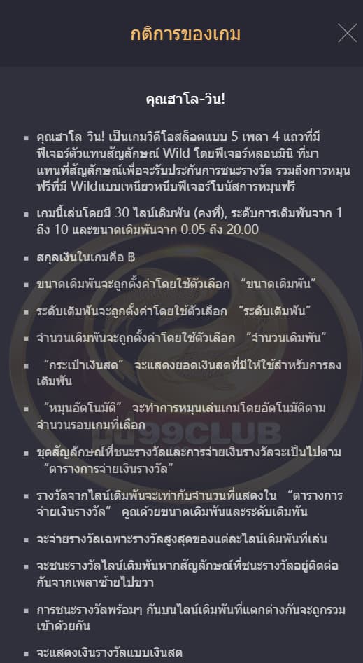 Mr.Hallow-Win เป็นเกมสล็อตวิดีโอ 5 เพลา 4 แถวที่มีฟีีเจอร์ตัวแทนสัญลักษณ์ Wild โดยที่ฟีเจอร์หลอนนิดๆที่มาแทนที่สัญลักษณ์เพื่อจะรับประกันการชนะรางวัล รวมถึงการหมุนฟรีที่มี Wild แบบเหนียวหนึบฟีเจอร์โบนัสการหมุนฟรี