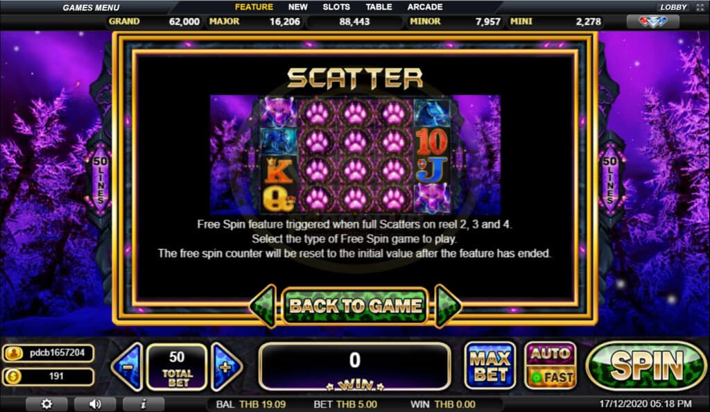 สัญลักษณ์ Scatter ฟีเจอร์ Free Spin จะทำงานเมื่อ Scatters เต็มในรีล 2, 3 และ 4 เลือกประเภทของเกม Free Spin ที่จะเล่น ตัวนับการหมุนฟรีจะถูกรีเซ็ตเป็นค่าเริ่มต้นหลังจากคุณสมบัติสิ้นสุดลง