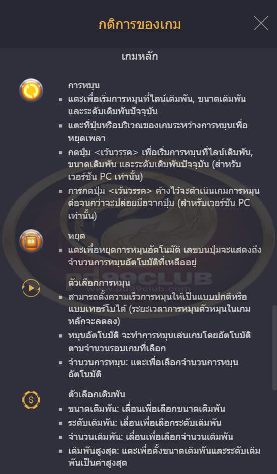 - กดปุ่ม <เว้นวรรค> เพื่อเริ่มต้นหมุนด้วยเดิมพันหลัก, ขนาดเดิมพันและระดับเดิมพันในปัจจุบัน (สำหรับเวอร์ชั่น PC เท่านั้น)