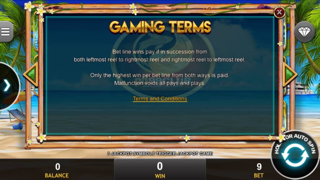 เงื่อนไขการเล่นเกมสายการเดิมพันจะได้รับเงินหากต่อเนื่องกันจากรีลซ้ายสุดไปยังรีลขวาสุดและรีลขวาสุดไปยังรีลซ้ายสุด เฉพาะผู้ชนะสูงสุดต่อไลน์เดิมพันจากทั้งสองวิธีเท่านั้นที่จะได้รับเงิน การทำงานผิดพลาดจะทำให้การจ่ายเงินและการเล่นทั้งหมดเป็นโมฆะ