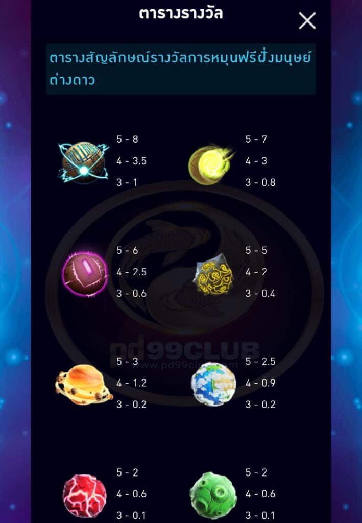 - ตารางสัญลักษณ์รางวัลการหมุนฟรีฝั่งมนุษญ์ต่างดาวเกม Solar Space มีทั้งหมด 8 สัญลักษณ์