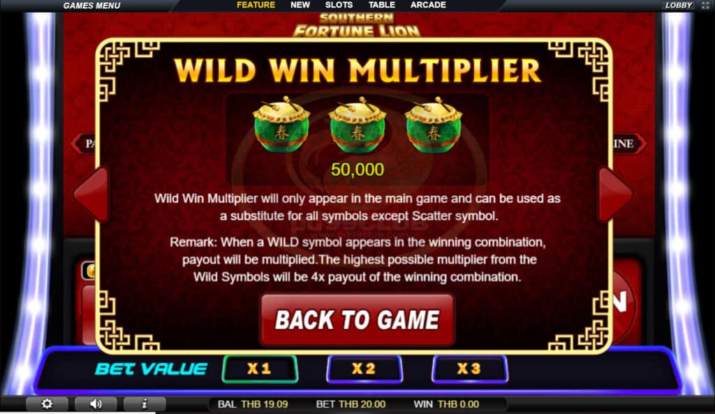 สัญลักษณ์ Wild Win Multiplier จะปรากฏในเกมหลักเท่านั้นและสามารถใช้แทนสัญลักษณ์ทั้งหมดได้ยกเว้นสัญลักษณ์ Scatter หมายเหตุ: เมื่อสัญลักษณ์ WILD ปรากฏในชุดค่าผสมที่ชนะการจ่ายเงินจะทวีคูณตัวคูณสูงสุดที่เป็นไปได้จากสัญลักษณ์ป่าจะเป็นการจ่ายเงิน 4 เท่าของชุดค่าผสมที่ชนะ