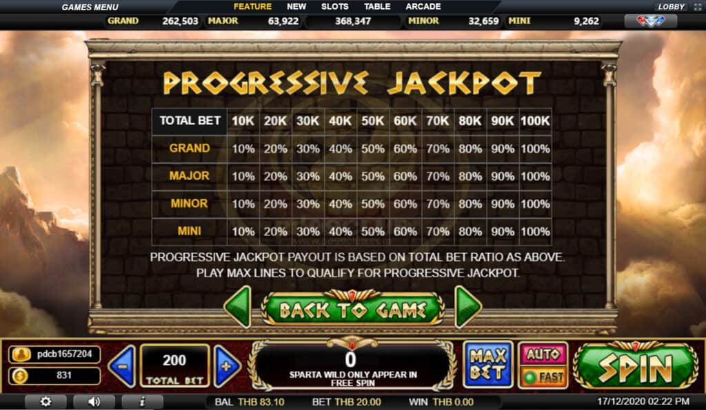 สัญลักษณ์ Progressive Jackpot การจ่ายเงินแจ็คพอตแบบก้าวหน้าขึ้นอยู่กับอัตราส่วนการเดิมพันทั้งหมดที่กล่าวมา เล่น MAX LINES เพื่อคุณสมบัติสำหรับแจ็คพอตที่ก้าวหน้า