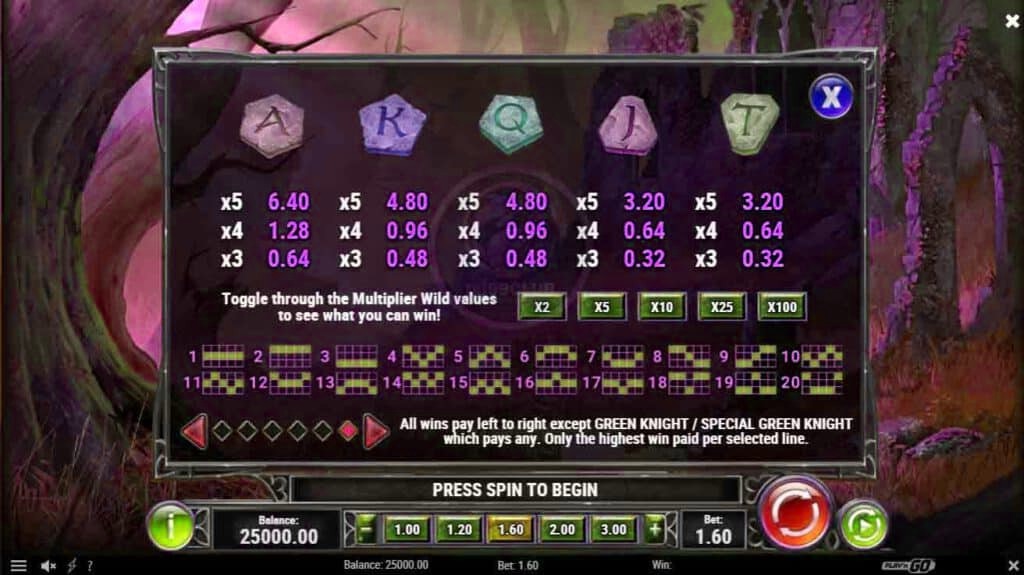 อาศัยคุณสมบัติพิเศษที่หลากหลาย และบางคุณสมบัติก็ค่อนข้างน่าประทับใจ มันอาจจะไม่ใช่กรณีของสัญลักษณ์เสริมทั่วไป แม้ว่าจะสามารถจ่าย 100x ของเงินเดิมพันในแต่ละบรรทัดที่มันครอบคลุมทั้งหมด และเวลาที่เหลือก็สามารถทดแทนได้ ไวด์ทวีคูณยังเป็นไปได้และสิ่งเหล่านี้สามารถเพิ่มชัยชนะได้ 100x , 25x , 10x , 5x หรือ 2x ด้วยภาพลักษณ์ที่เกือบจะเหมือนผีของ Green Knight ที่แสดงในชุดเกราะของเขาและล้อมรอบด้วยออร่าสีเขียว เราได้รับสัญลักษณ์กระจายซึ่งสามารถกระตุ้นการหมุนฟรี ให้แสดง 3 , 4 หรือ 5 รายการเพื่อรับรางวัล (สูงสุด 100x ของเงินเดิมพัน) และรับ 5 ฟรีสปิน แม้ว่าจะมีเพียง 5 รอบเท่านั้น แต่แต่ละรอบจะได้รับสัญลักษณ์ตัวคูณเสริมที่เพิ่มเข้ามาในมุมมอง รอบแรกจะได้รับตัวคูณไวด์ 2x , ตัวที่สองมีตัวคูณ 5x , รอบที่สามได้ไวด์ 10x จากนั้นไวด์ 25x สำหรับสปินที่สี่และสุดท้ายตัวคูณไวด์ 100x สำหรับสปินที่ห้าและรอบสุดท้าย ในระหว่างเกมฟรีคุณสามารถเข้าถึง Shield Spins ได้ อีกครั้งที่คุณมี 5 รอบที่ต้องผ่าน โดยใช้ตัวคูณไวด์จากรอบทริกเกอร์ด้วยวิธีนี้ คุณสามารถมี 5 สปินพร้อมตัวคูณไวด์ 100 เท่า