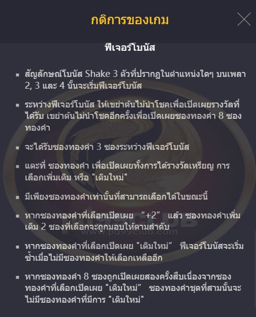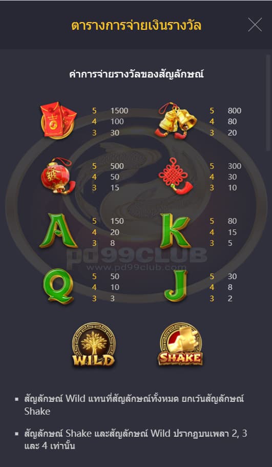 - สัญลักษณ์ Shake และสัญลักษณ์ Wild ปรากฏบนเพลา 2,3 และ 4 เท่านั้น