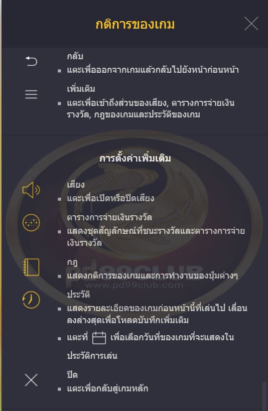 - เเตะเพื่อเข้าถึงส่วนของเสียง ตารางการจ่ายเงิน รางวัล กฏของเกมและประวัติของเกม