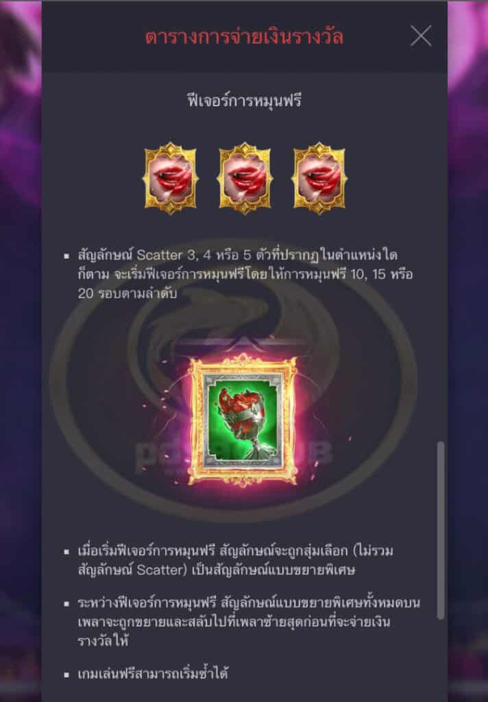 - จะเล่นฟีเจอร์การหมุนฟรีด้วยขนาดและระดับเดิมพันเดียวกันกับการหมุนฟีเจอร์ฟรีนั้น