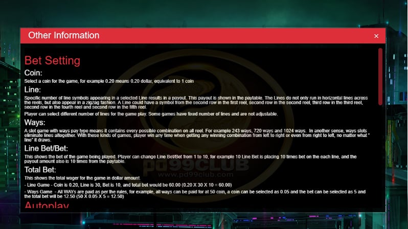 - ทุกรูปแบบจะได้รับเงินตามกฎตัวอย่างเช่นทุกรูปแบบสามารถจ่ายได้ 50 เหรียญสามารถเลือกเหรียญเป็น 0.05 และสามารถเลือกเดิมพันเป็น 5 แล้วเดิมพันทั้งหมดจะเท่ากับ 12.50 (50 X 0.05 X 5 = 12.50)