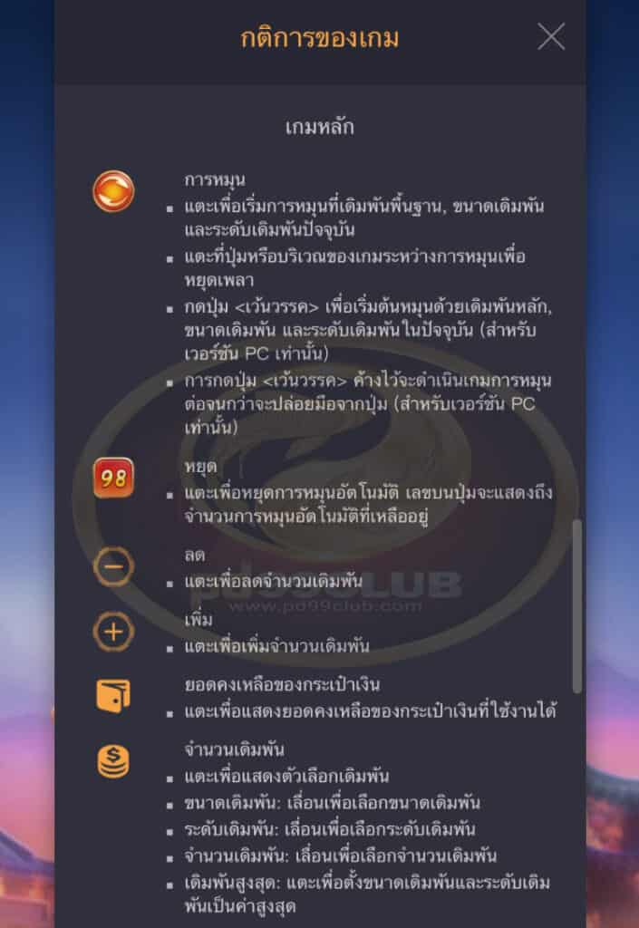 - จะเล่นฟีเจอร์การหมุนฟรีด้วยขนาดและระดับเดิมพันเดียวกันกับการหมุนที่เริ่มฟีเจอร์การหมุนฟรีนั้น