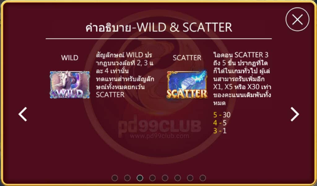 สัญลักษณ์ Scatter ไอคอน Scatter 3-5 ขึ้นไป ปรากฏที่ใดก็ได้ในเกมทั่วไป ผู้เล่นสามารถรับเพิ่มอีก คูณ1,คูณ5 หรือ คูณ 30 เท่าของคะแนนเดิมพันทั้งหมด